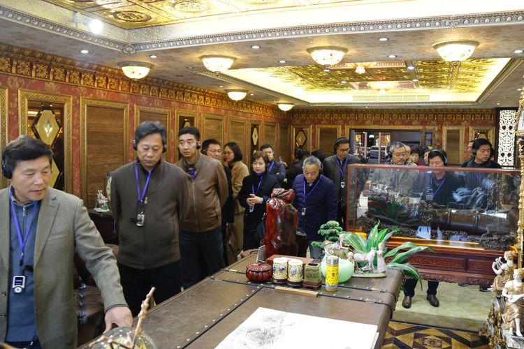 在滨江三号沉香艺术博物馆,大家坐在长13米、重50吨、选用2500多年树龄缅甸花梨古木制作而成的大班桌椅前面合影留念。他们直呼真是太震撼了,这是他们见过的最硕大的大班桌椅套件!在此合影很有意义,这是永久的留念!