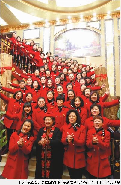 如果你是亚萍微友或是亚萍员工微友,也许在春节期间会从手机上看到一道“景观”,是陆亚萍与一个个班组或一个个员工合影。无论男女老少,只要节日加班,就会得到这一特殊形式的拜年,有许多照片则被晒到微信里。年初一,她来到南通亚萍国际购物广场,与员工们一一合影后,感谢大家过去一年所付出的努力和奉献;在与江苏亚萍国际艺术馆管理团队合影后,她对大家在接待工作上所展示的良好形象表示满意。据悉,这一年国内外有二三十万人次先后参观亚萍国际艺术馆,目前该馆已成为江苏省文化产业的靓丽名片。当天晚上,亚萍集团还在这里举行隆重新春拜年晚会,陆亚萍率部分高管通过新媒体向全国的亚萍消费者和各界朋友拜年。晚会上,亚萍艺术团表演了精彩文艺节目,集团总裁施建新要求全体员工不忘初心,砥砺奋进,推动亚萍集团加快迈向新时代。
